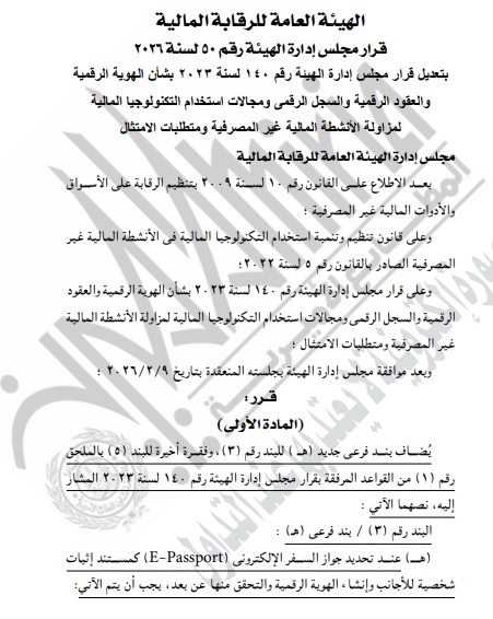 أدخلت هيئة الرقابة المالية تعديلات جديدة على قرار الهوية الرقمية والعقود الرقمية والسجل الرقمي ومجالات استخدام التكنولوجيا المالية لمزاولة الأنشطة غير المصرفية ومتطلبات الإمتثال وفقاً لما تم نشره في الوقائع المصرية.