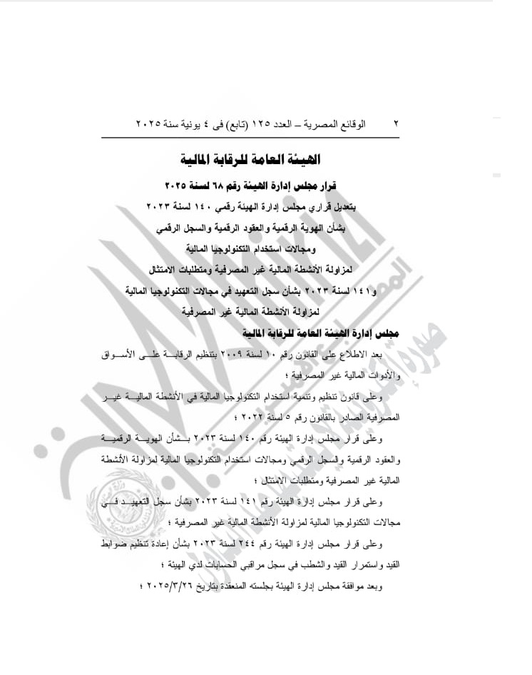 أصدرت هيئة الرقابة المالية قرارًا رقم 68 لسنة 2025 بشأن تعديل ضوابط بشأن الهوية الرقمية والعقود الرقمية والسجل الرقمي وسجل التعهيد ومجالات استخدام التكنولوجيا المالية لمزاولة الأنشطة المالية غير المصرفية.
