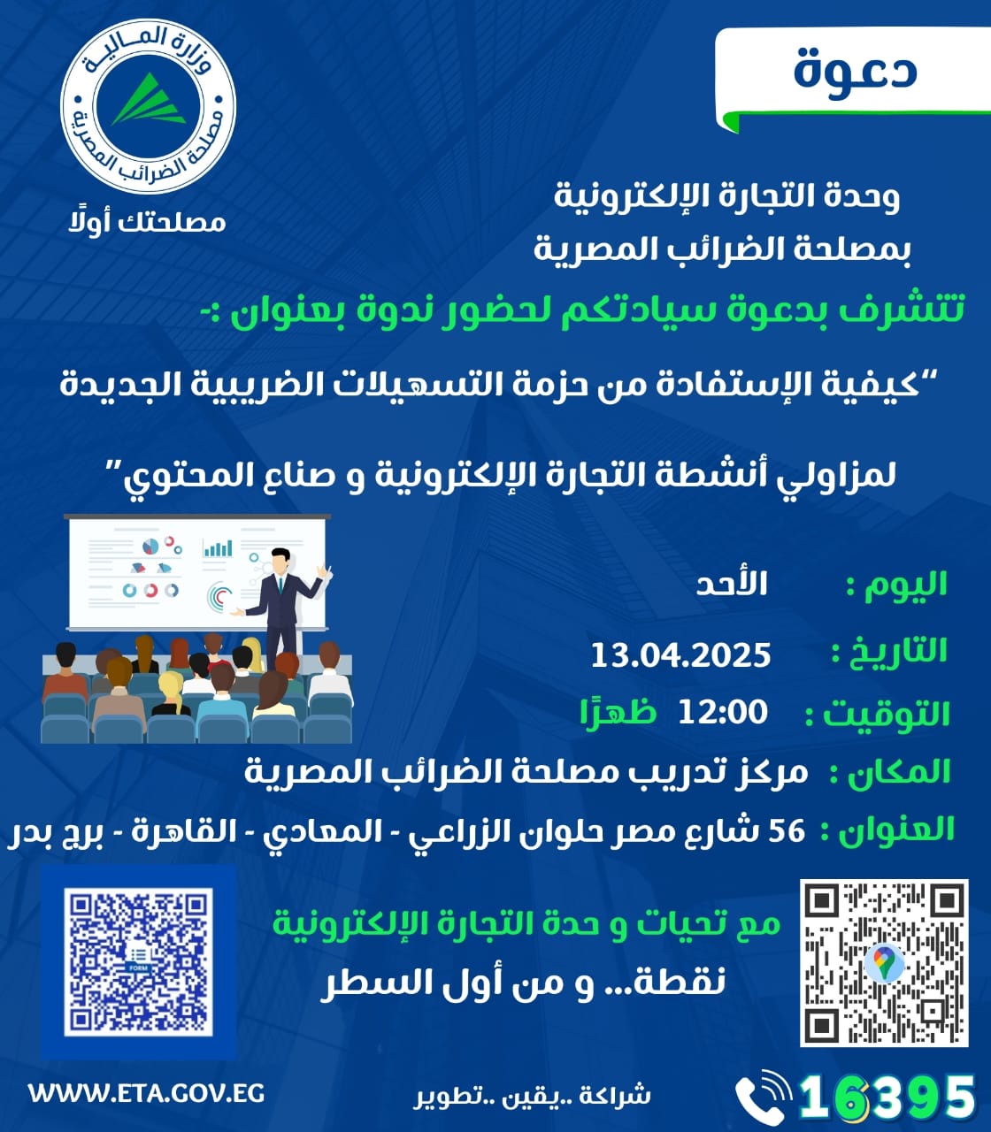 تنظم وحدة التجارة الإلكترونية بمصلحة الضرائب المصرية ندوة توعوية جديدة بعنوان: “كيفية الاستفادة من التسهيلات الضريبية الجديدة لمزاولي أنشطة التجارة الإلكترونية وصناع المحتوى”.