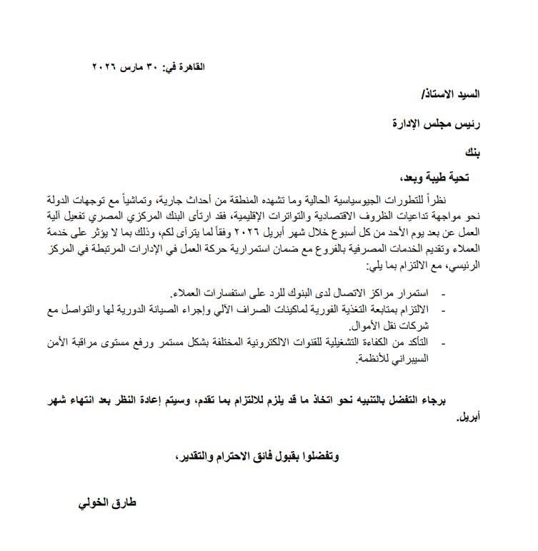 فقد ارتأى البنك المركزي المصري تفعيل آلية العمل عن بعد يوم الأحد من كل أسبوع خلال شهر أبريل ٢٠٢٦ وفقاً لما يتراءى لكم، وذلك بما لا يؤثر على خدمة العملاء وتقديم الخدمات المصرفية بالفروع مع ضمان استمرارية حركة العمل في الإدارات المرتبطة في المركز الرئيسي